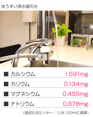 水道のにごりを40%除去するため、透明度の高い水になります。また、ミネラルバランスを整えるチカラもあり、例えばカルシウムの多い沖縄などの水は、余分なカルシウムを除去し、美味しい水にします。