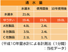 浄水器の水量の少なさ、イライラしますよね。でも、ゆうすいなら大丈夫。ろ過流量は水道水とほぼ同じ水量で、JIS規格による通水量は1分間に9.8リットル!他社カートリッジタイプは1分間に2リットル前後。約5倍です。飲食店でも利用して頂いています。