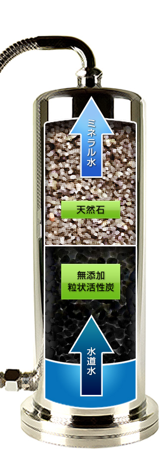 天然のミネラルが水道水の約10%増え、甘みが増します。風化した天然石のイオン交換作用により、長期にわたりミネラルを溶出します。